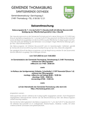 Bekanntmachung zum Bebauungsplan Nr. 7 „Vor der Furth II“ 3. Bauabschnitt mit örtlicher BauvorschriftBeteiligung der Öffentlichkeit gemäß § 3 Abs. 2 BauGB